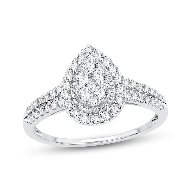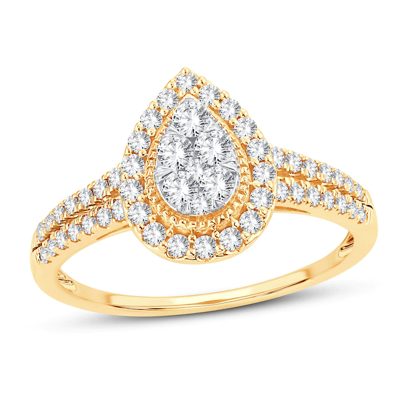 This enchanting engagement ring for her features a pear-shaped center design embellished with sparkling round-cut diamonds. Round diamonds and mil grain detailing frame the center, and two...Regular price $800.00 USDSale price $800.00 USD Regular priceUnit price / per -